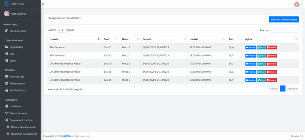 Esta tela apresenta todos os planejamentos cadastrados para o período universitário, permitindo uma visualização clara e organizada das reservas recorrentes,