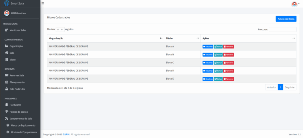 Cada bloco está associado a uma organização e conta com ações rápidas para ver detalhes, editar informações ou remover registros, além de permitir o cadastro de novos blocos de forma centralizada.
