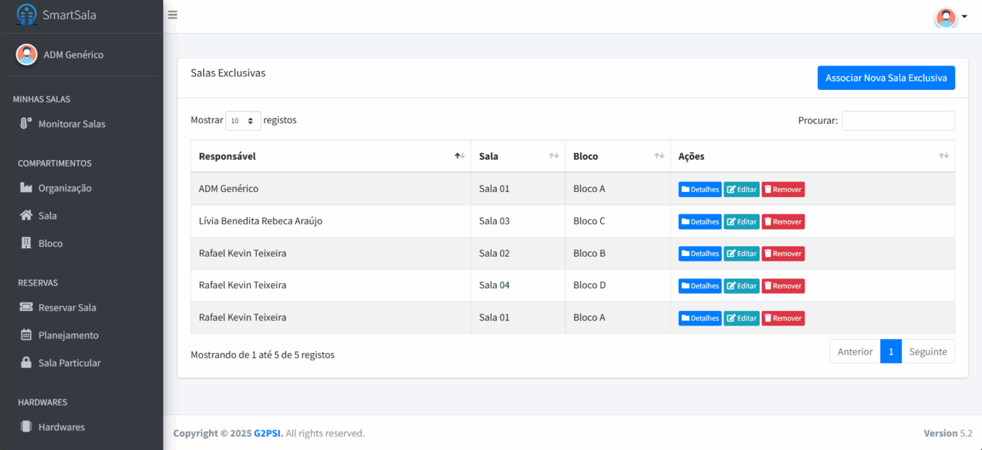 Esta funcionalidade permite associar salas exclusivas a responsáveis (professores ou administradores).