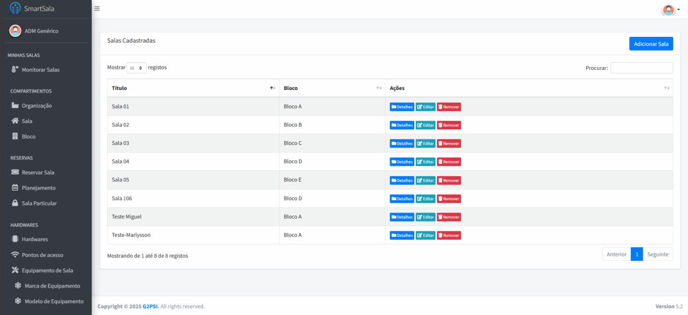 O usuário pode visualizar detalhes, editar informações ou remover salas conforme necessário, além de adicionar novas salas de forma rápida e organizada.