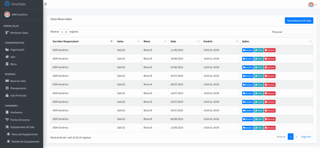 Esta tela apresenta todas as reservas de salas cadastradas no sistema, permitindo visualizar informações como responsável, sala, bloco, data e horário.